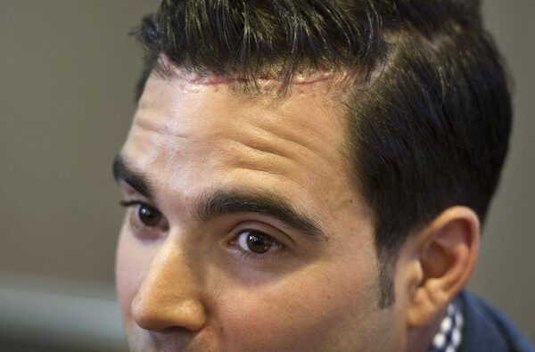 Canadian diver Alexandre Despatie's scar is seen on his forehead as a result of a diving accident while training in Spain last month Thursday, July 5, 2012 in Montreal.Paul Chiasson/The Canadian Press