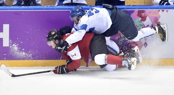 Finland's Juhamatti Aaltonen (top) takes down Canada's Jonathan Toews during second period preliminary round hockey action at the 2014 Sochi Winter Olympics in Sochi, Russia on Sunday, February 16, 2014.Nathan Denette/The Canadian Press