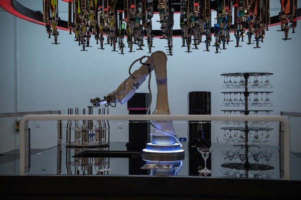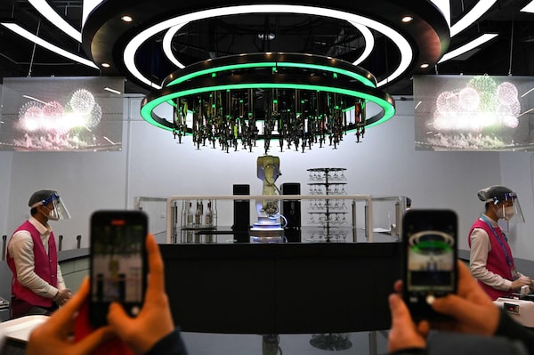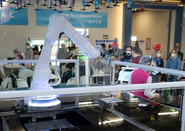 A robotic bartender mixes drinks at the main media centre at the 2022 Winter Olympics in Beijing.Ryan Remiorz/The Canadian Press