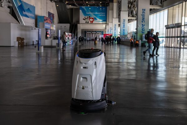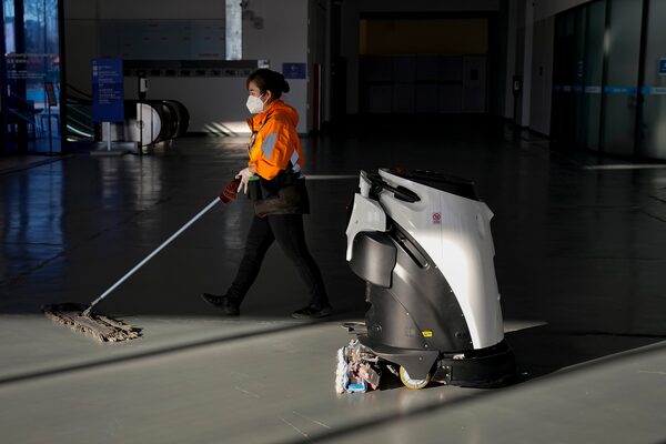 A worker and a robotic janitor clean the floor of the main media center ahead of the 2022 Winter Olympics, in Beijing.Jae C. Hong/The Associated Press