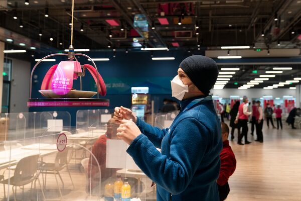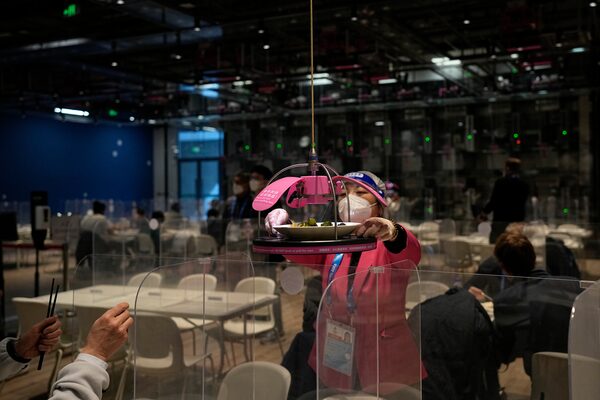 Canadian technician Matthew Potvin reaches for his lunch delivered to him robotically in the dining area of the main media center at the 2022 Winter Olympics in Beijing.Jae C. Hong/The Associated Press