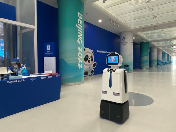 Don’t let its cute blue tie and shirt collar fool you. The robot roaming the hallways at the Ice Cube curling venue is all business at the Olympic Games. Standing about four feet tall with a black base, white midsection and video screen for a face, the robot takes the temperature of anyone who crosses its path. Walk within six or seven metres of the robot and it will take your temperature. One intrigued journalist crossed the hall and saw their image with a 36.0 C reading in green colouring appear on the screen. Strict restrictions are in place during the Winter Olympics as China pursues a zero-COVID strategy. Olympic-related personnel, media and athletes are in a closed-loop bubble for the Games, which continue through Feb. 20. Robots are in use at several Olympic venues. In the main media centre, a large robotic arm mixes and pours drinks in the bar area. Robot chefs prepare food and large robot vacuums help keep the floors clean.