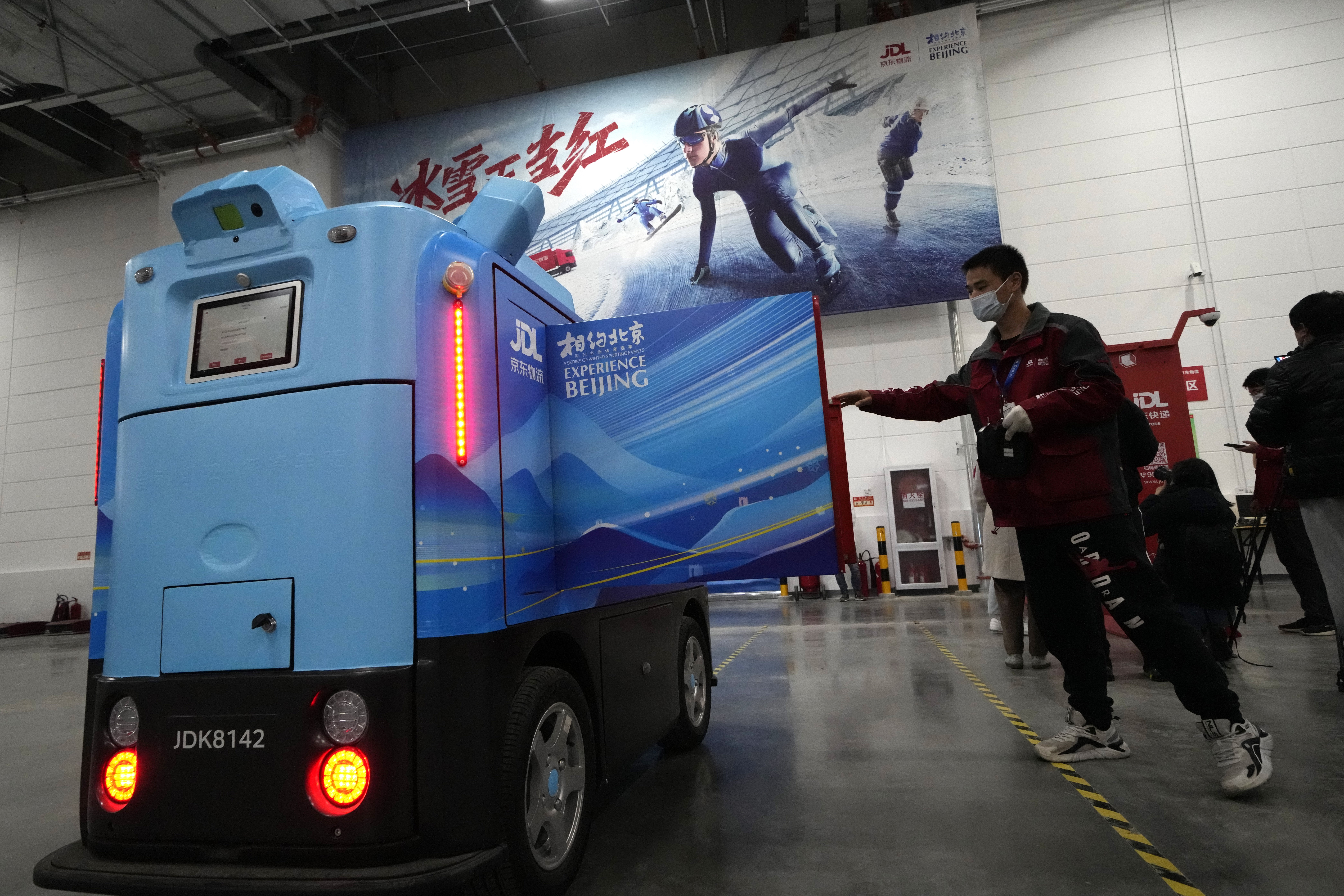 A worker opens the door of a delivery robot at the Main Distribution Center built to provide logistic support for the upcoming Beijing Winter Olympics and Paralympics in Beijing, China.Ng Han Guan/The Associated Press