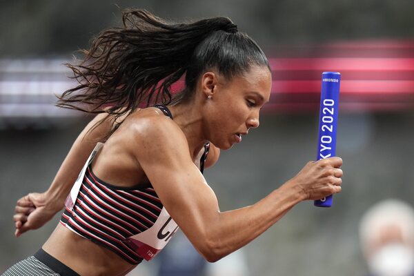 Alicia Brown, of Canada, starts in the final of the women's 4 x 400-meter relay at the Tokyo Summer Olympics. Canada finished fourth in the event.Petr David Josek/The Associated Press