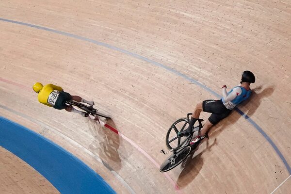 Hugo Barrette of Team Canada (94) crashes as Matthew Richardson of Team Australia (84) rides on during the track cycling men's keirin race at the Tokyo Summer Olympics.Christophe Ena/The Associated Press