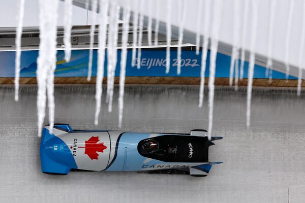 Christine De Bruin of Canada and teammate in during training in the 2-woman bobsleigh at the Beijing Winter Olympics.THOMAS PETER/Reuters