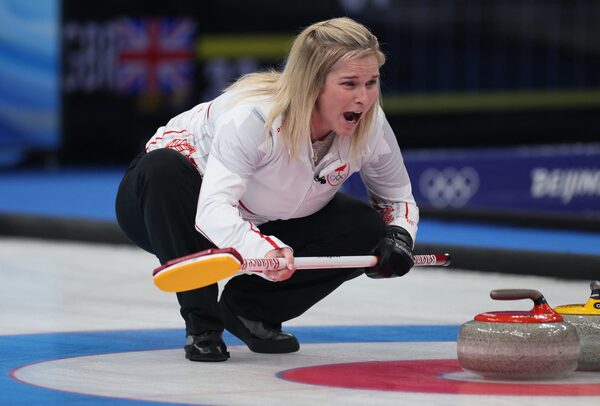 Skip Jennifer Jones of Canada in action against Denmark in curling match at the Beijing Winter Olympics. Canada won 10-4 but finished 5th so will not advance to semifinals.EVELYN HOCKSTEIN/Reuters