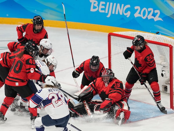 Team Canada goalkeeper Ann-Renee Desbiens makes a save against the U.S. during third period action at the Beijing Winter Olympics.Ryan Remiorz/The Canadian Press