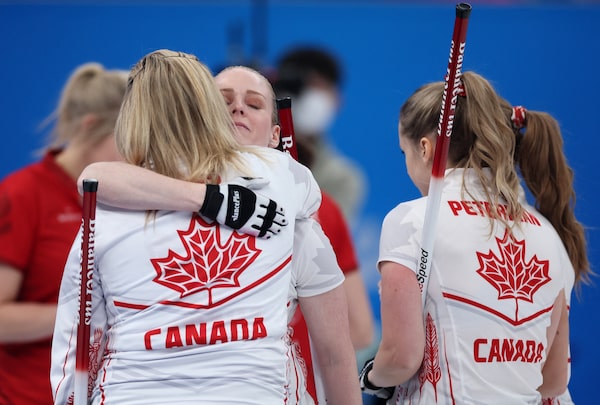 Skip Jennifer Jones of Canada, Vice Kaitlyn Lawes, Jocelyn Peterman and Dawn McEwen after their curling match against Denmark. Canada won 10-4 but finished 5th so will not advance to semifinals.EVELYN HOCKSTEIN/Reuters