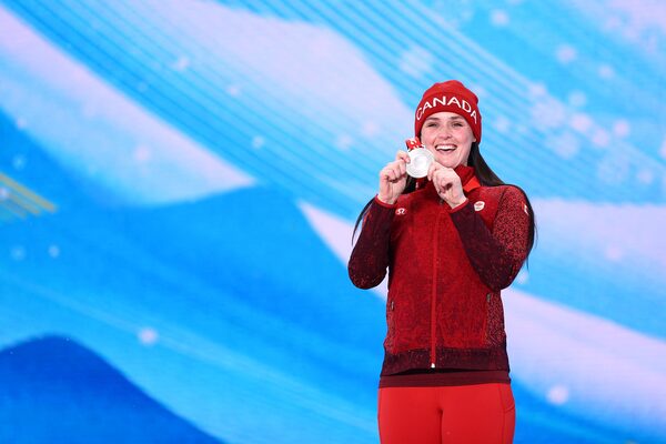 Silver medallist Marielle Thompson of Canada celebrates on the podium during the victory ceremony at the Beijing Winter Olympics.LISI NIESNER/Reuters