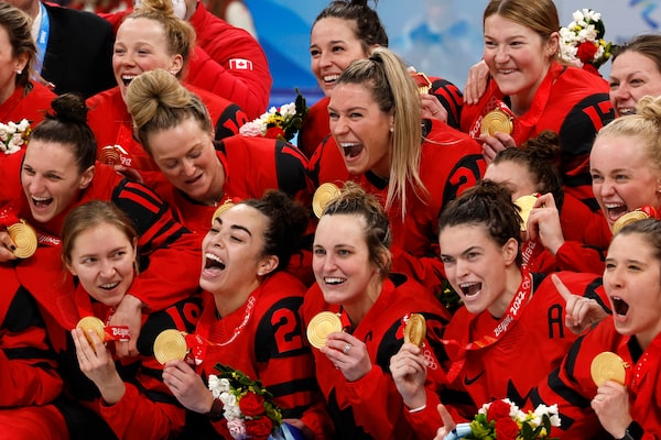 Team Canada celebrates with their gold medals after defeating the U.S. in women's hockey final game at the Beijing Winter Olympics.Ryan Remiorz/The Canadian Press