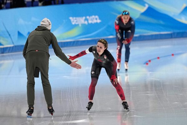 Alexa Scott of Canada reacts after her heat in the women's speed skating 1,000m finals at the Beijing Winter Olympics. Scott finished in 12th place.Sue Ogrocki/The Associated Press