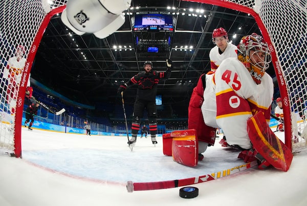 China's goalie Jieruimi Shimisi concedes a goal scored by Canada's Jordan Weal during the men's qualification round game at the Beijing Winter Olympics.MATT SLOCUM/Reuters