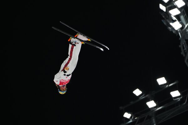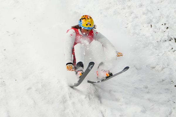 Miha Fontaine of Canada sticks his landing on his second jump as he competes in the men's freestyle skiing aerials qualification round at the Beijing Winter Olympics. He would finish 13th just one spot shy of qualifying.Sean Kilpatrick/The Canadian Press