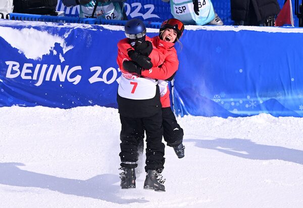 China’s Eileen Gu finished celebrates her silver medal run in women’s slopestyle skiing, behind Switzerland’s Mathilde Gremaud. Estonian Kelly Sildaru took bronze.DYLAN MARTINEZ/Reuters