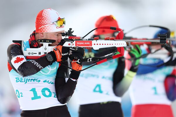 Christian Gow of Canada shoots during men's biathlon 4x7. 5km relay at the Beijing Winter Olympics.Clive Rose/Getty Images AsiaPac