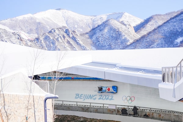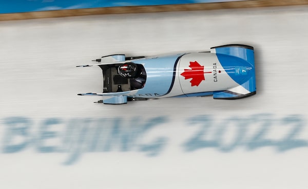 Christopher Spring and Mike Evelyn, of Canada, slide during the 2-man heat 1 at the Beijing Winter Olympics.THOMAS PETER/Reuters