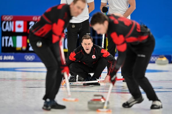 Canada's Brad Gushue reacts during the mens round robin game of the Beijing Winter Olympics between Canada and Italy, at the National Aquatics Centre in Beijing. Canada won 7-3.LILLIAN SUWANRUMPHA/AFP