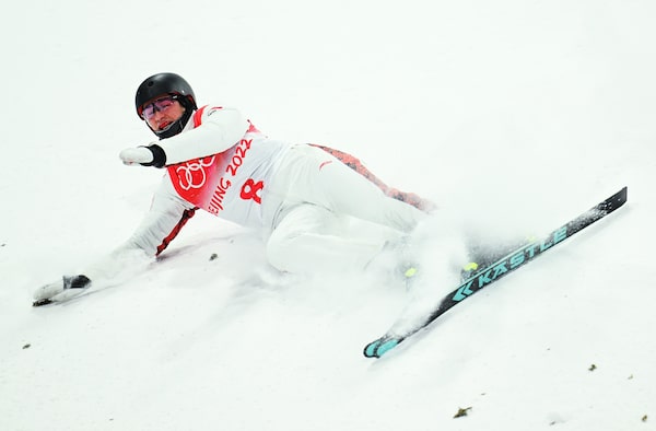 Canada's Marion Thenault crashes in the women's freestyle skiing aerials finals at the Beijing Winter Olympics.Matthias Hangst/Getty Images AsiaPac