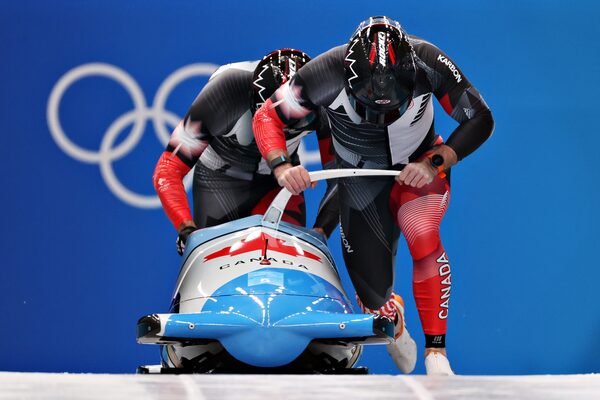 Justin Kripps and Cam Stones of Team Canada push off at the start slide during the 2-man Bobsleigh Heats on day 10 of Beijing Winter Olympics.Alex Pantling/Getty Images AsiaPac