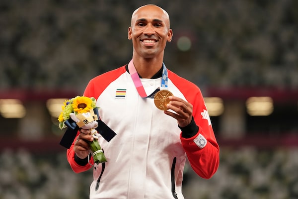 Gold medalist Damian Warner, of Canada, poses during the medal ceremony for the decathlon at the Tokyo Summer Olympics.Martin Meissner/The Associated Press