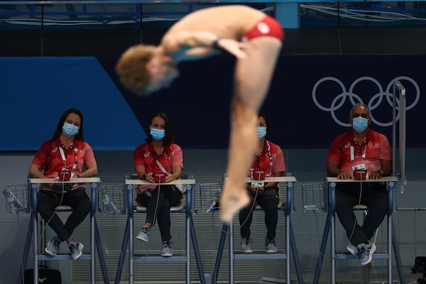 Judges watch Rylan Wiens of Canada in the men's 10m dive at the Tokyo Olympics.ANTONIO BRONIC/Reuters
