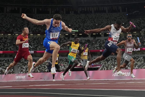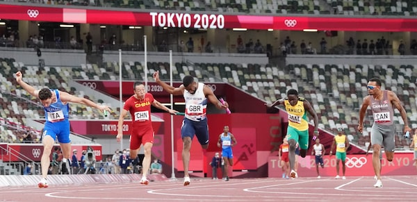 Filippo Tortu, of Italy, crosses the finish line ahead of Nethaneel Mitchell-Blake, of Britain, and far right Andre De Grasse for bronze, in the men's 4x100-meter relay at the Tokyo Summer Olympics.David J. Phillip/The Associated Press