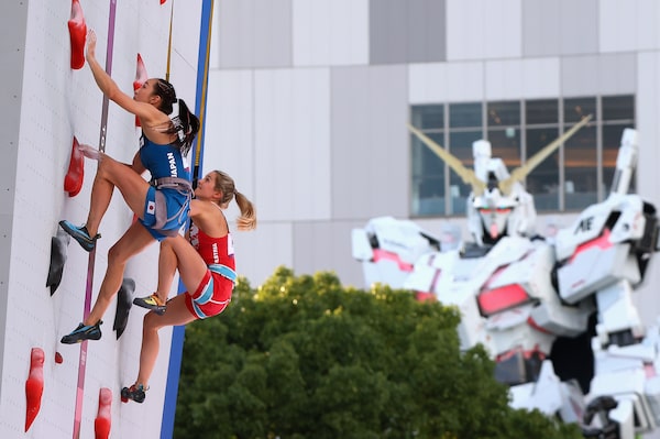 Akiyo Noguchi of Japan and Jessica Pilz of Austria competes during the speed portion of the sport climbing final at the Tokyo Summer Olympics.MAXIM SHEMETOV/Reuters