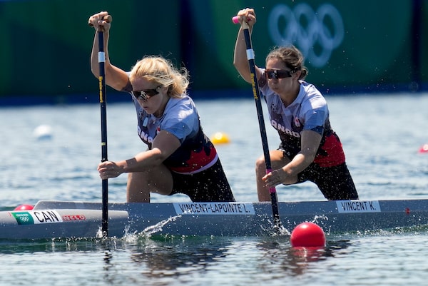 Laurence Vincent-Lapointe, and Katie Vincent, of Team Canada, compete in the women's canoe double 500m quarterfinal during the Tokyo Summer Olympics.Kirsty Wigglesworth/The Associated Press
