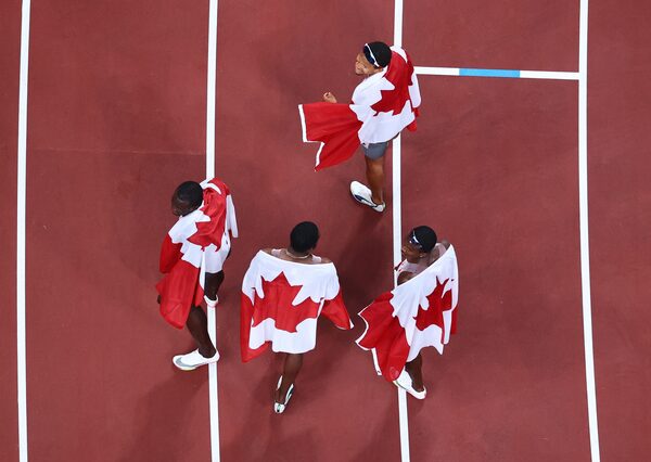 Aaron Brown of Canada, Jerome Blake of Canada, Brendon Rodney of Canada and Andre De Grasse of Canada celebrate winning bronze in the men's 4x100-meter relay at the Tokyo Summer Olympics.FABRIZIO BENSCH/Reuters