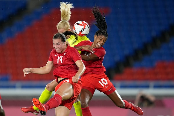 Canada's Vanessa Gilles, left, Ashley Lawrence, right, and Sweden's Stina Blackstenius go for a header during the women's final soccer match at the Tokyo Summer Olympics.Andre Penner/The Associated Press