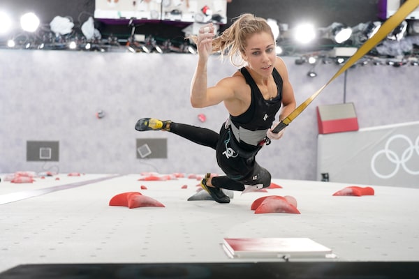 Aleksandra Miroslaw, of Poland, competes during the speed portion of the sport climbing final at the Tokyo Summer Olympics.Tsuyoshi Ueda/The Associated Press