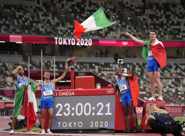 From right: Filippo Tortu, Eseosa Desalu, Lorenzo Patta and Lamont Jacobs, of Italy celebrate after taking the gold medal in the final of the men's 4 x 100-meter relay at the Tokyo Summer Olympics.Charlie Riedel/The Associated Press
