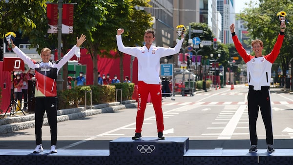 Gold medallist Dawid Tomala of Poland on the podium with silver medallist Jonathan Hilbert of Germany and bronze medallist Evan Dunfee of Canada in the 50km race walk at the Tokyo Olympics.FELINE LIM/Reuters