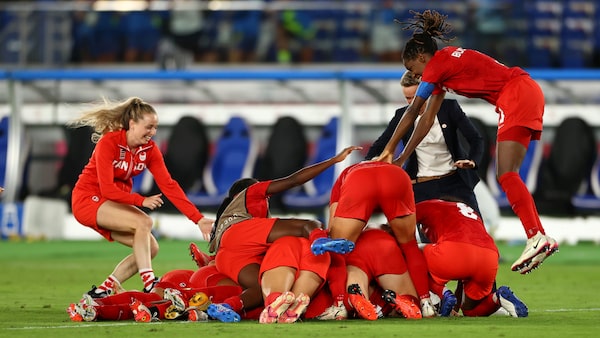Canada women's soccer team celebrates winning the gold medal against Sweden at the Tokyo Olympics.Melissa Tait/The Globe and Mail