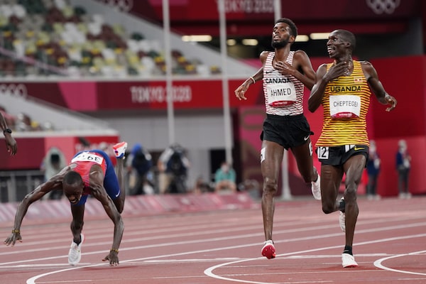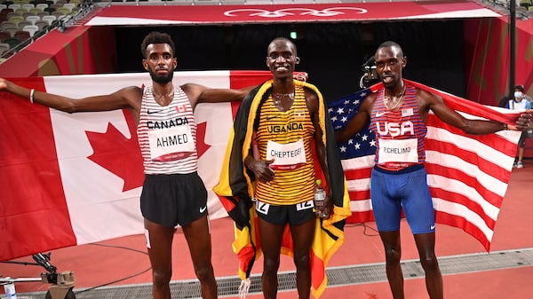 Mohammed Ahmed of Canada, centre, reacts after winning the silver medal in the Men's 5000m final during the summer Tokyo Olympics.Nathan Denette/The Canadian Press
