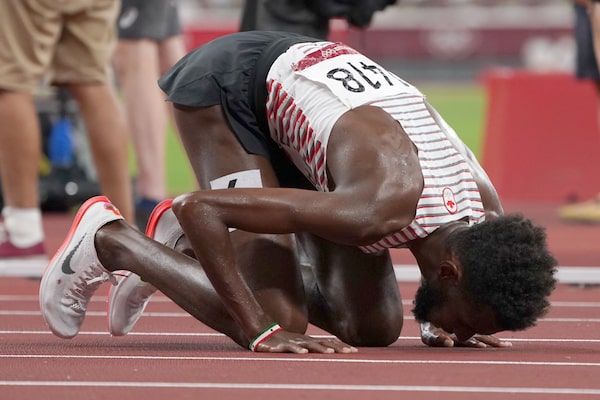 Canada's Mohammed Ahmed kisses the track after winning the silver medal in the men's 5000-metre final during the Tokyo Olympics.Nathan Denette/The Canadian Press
