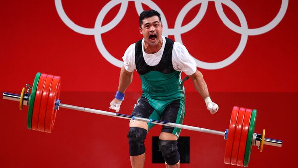 Rejepbay Rejepov of Turkmenistan reacts after a lift in the men's 81kg weightlifting at the Tokyo Olympics.EDGARD GARRIDO/Reuters