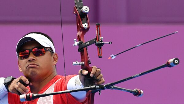 Crispin Duenas of Canada in action at the men's individual archery finals in Yumenoshima Archery Field at the Tokyo Olympics.CLODAGH KILCOYNE/Reuters