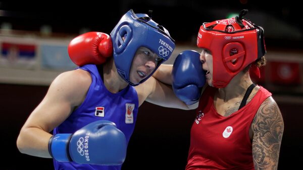 Nouchka Fontijn of the Netherlands in action against Canada's Tammara Thibeault match women's middleweight boxing quarterfinal at the Tokyo Olympics.UESLEI MARCELINO/Reuters