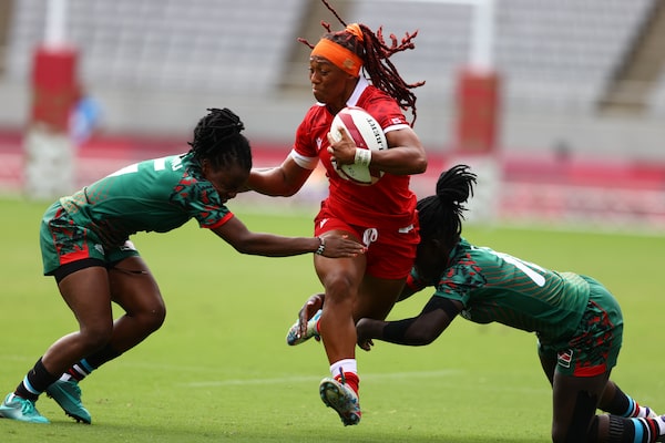 Canada's Charity Williams runs with the ball as Grace Adhiambo Okulu and Judith Okumu of Kenya attempt to stop her during their women's rugby sevens 9-10 placing match at the Tokyo Summer Olympics.SIPHIWE SIBEKO/Reuters