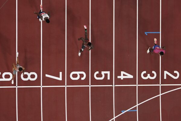 Patrick Grzegorzewicz of Poland celebrates as he crosses the finish line to win the 4 x 400-meter mixed relay at the Tokyo Summer Olympics.Charlie Riedel/The Associated Press