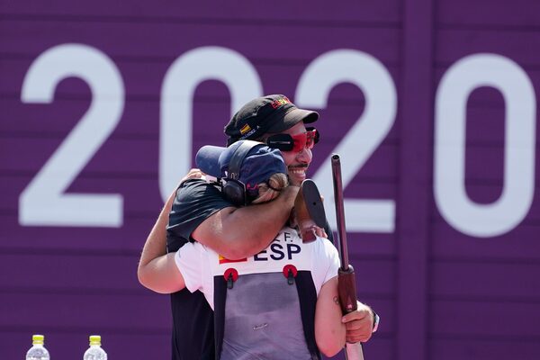 Gold medal winners Fatima Galvez, left, and Alberto Fernandez, both of Spain, celebrate after the mixed team trap at the Asaka Shooting Range in the Tokyo Summer Olympics.Alex Brandon/The Associated Press