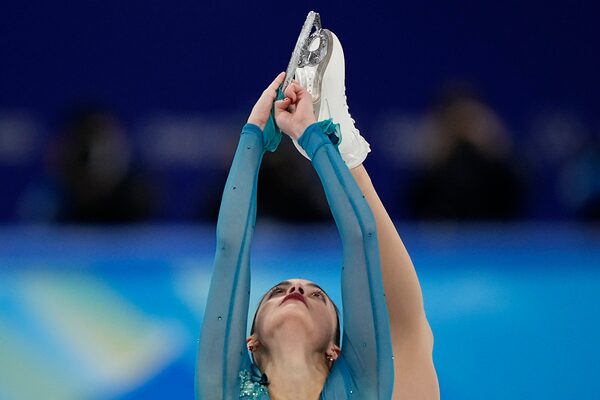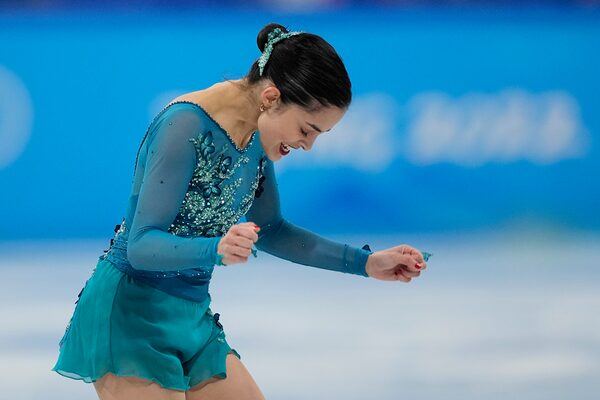 Madeline Schizas, of Canada, reacts after the women's team free skate program at the Beijing Winter Olympics.David J. Phillip/The Associated Press