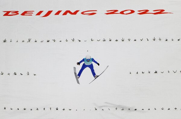 Canada's Matthew Soukup during the final Mixed Team Ski Jump at the Beijing Winter Olympics. Canada won bronze.LINDSEY WASSON/Reuters