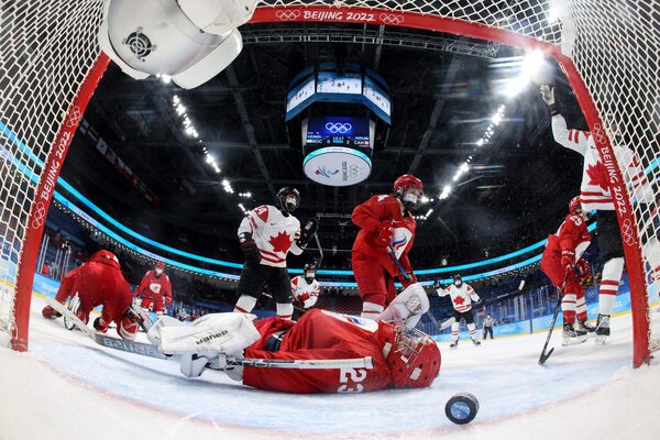 Team Canada players celebrate their third goal against Russian Olympic Committee's goaltender Daria Gredzen at the Beijing Winter Olympics.SONG YANHUA/AFP