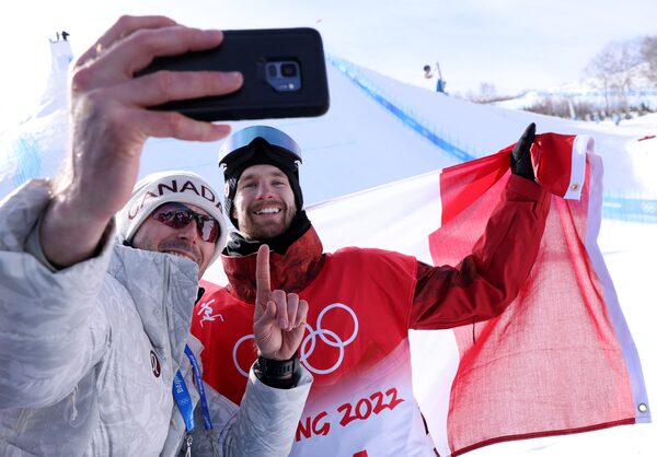 Canada's Max Parrot takes a selfie with mental performance coach Jean Franois Menard after winning gold at the Beijing Winter Olympics.MIKE BLAKE/Reuters