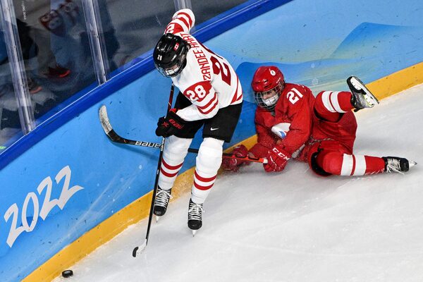 Canada's Micah Zandee-Hart and Russian Olympic Committee's Polina Bolgareva vie for the puck during the women's hockey at the Beijing Winter Olympics.ANTHONY WALLACE/AFP