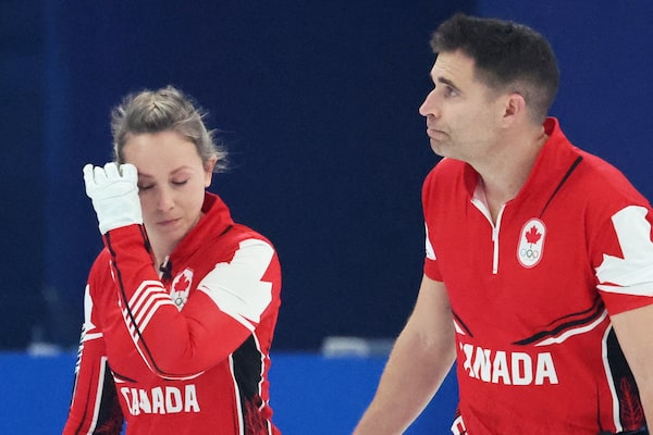 Canada's Rachel Homan and John Morris react after losing their match to Italy at the Beijing Winter Olympics.ELOISA LOPEZ/X06751
