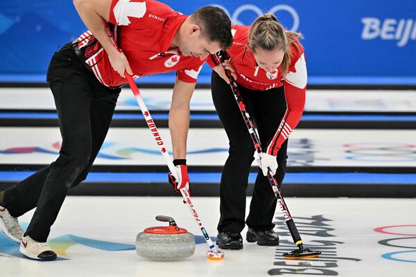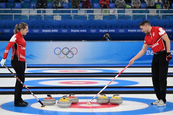 Canada's John Morris and Canada's Rachel Homan curl the stone during the mixed doubles round robin session 13 game of the Beijing Winter Olympic curling competition between Canada and Italy.LILLIAN SUWANRUMPHA/AFP